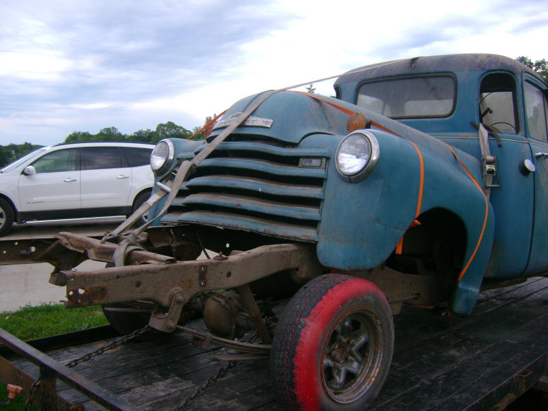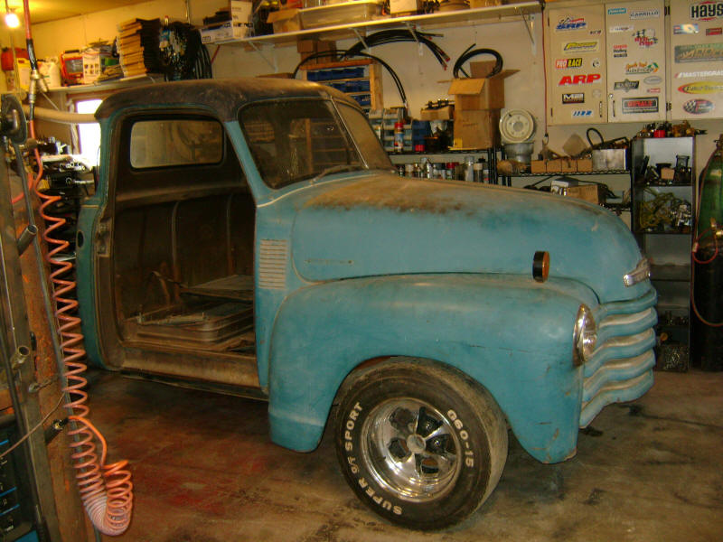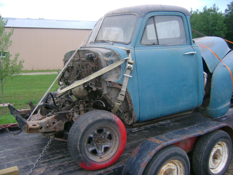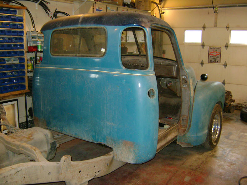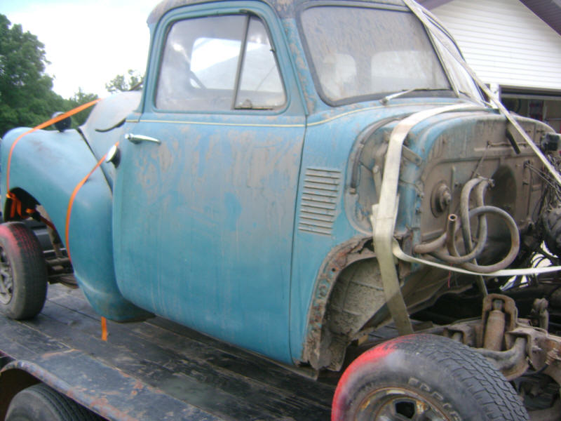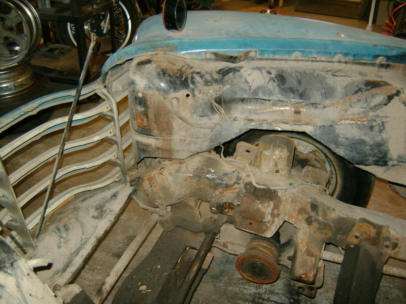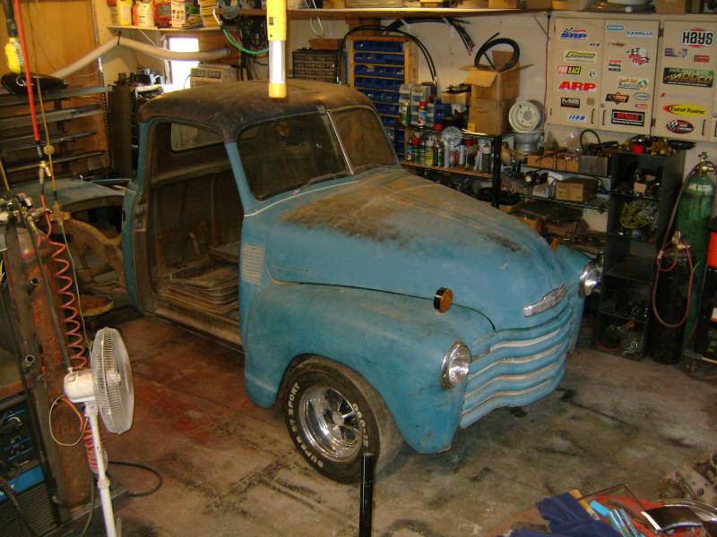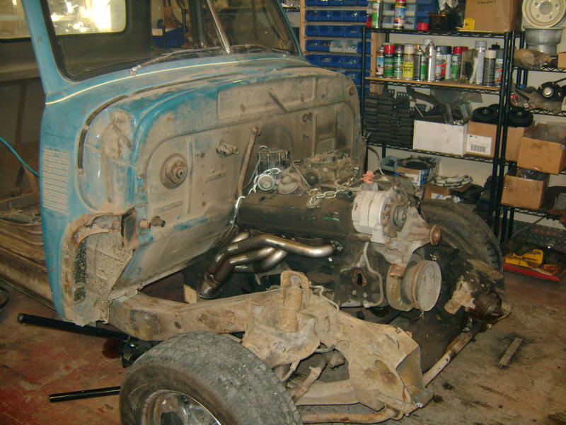 Got the truck moved inside and starting the mock up and assembly. The cab, font clip and motor are all fitted. The frame is cut and revamped in the front and ready for blasting and paint.