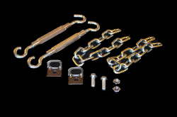 Turnbuckle Chain set keeps your equipment from swinging side to side. Has a 250# load buckles. Stainless steel loops bolt to your arms, providing a nice clean attachment point. Comes with hardware. Will fit other brands.