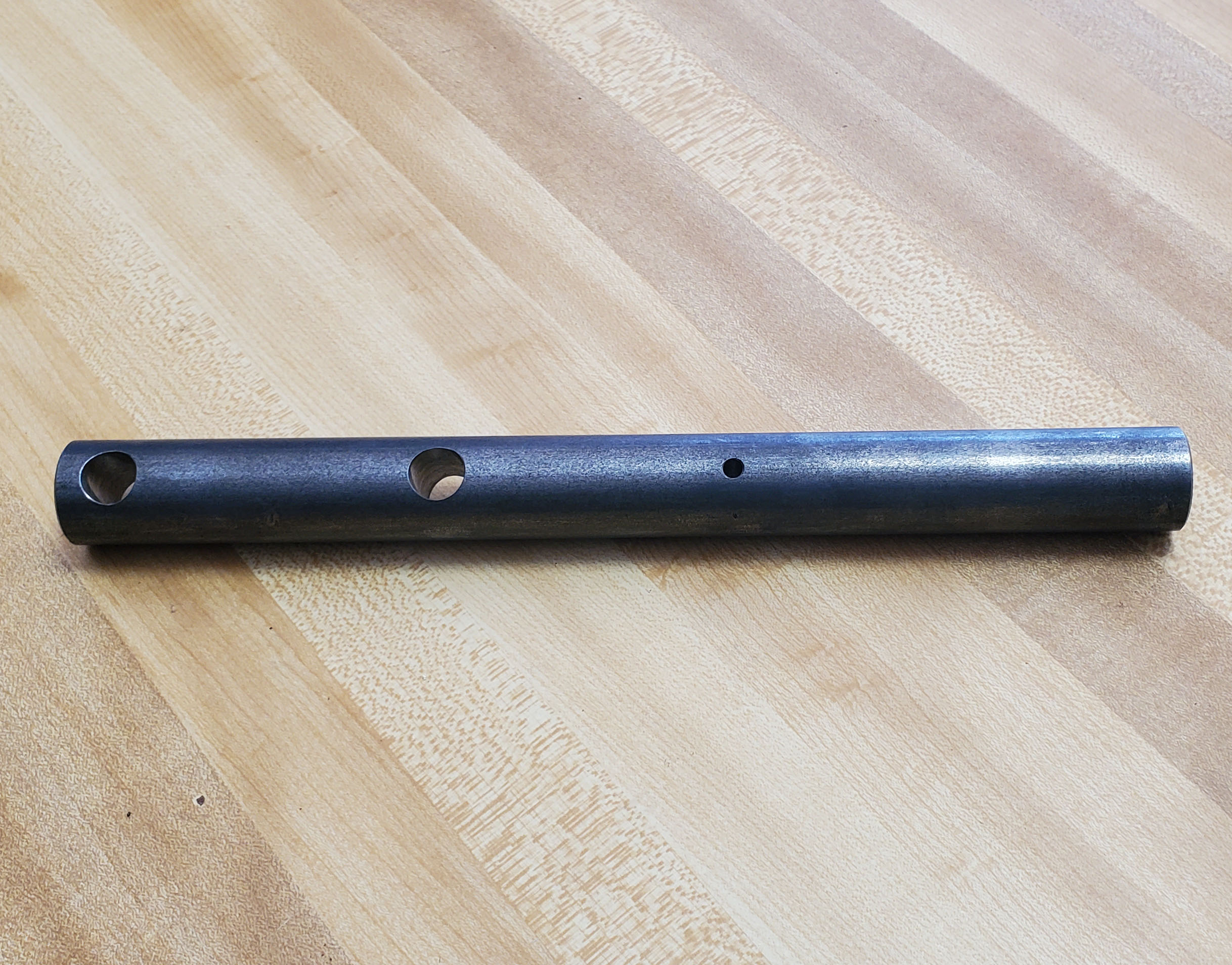Double drilled lift bar. Has dual 1/2" holes that are at the stock length and at +3" for extended lift. Small holes are drilled 90 degrees apart for use with sleeve hitch and tiller lift assemblies. UNPAINTED